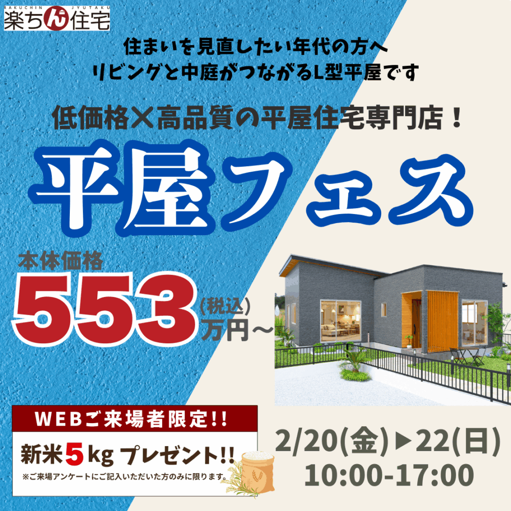 もうすぐバレンタインですね🍫💝街も少しずつ、甘い雰囲気になってきました😊そんな時期に、楽ちん住宅では低価格×高品質の平屋を実際に体感できる**平屋見学会「平屋フェス」**を開催します🏠✨ 会場は【茂原...